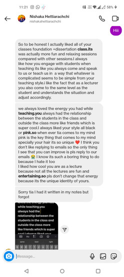 One of the key points were that I broke the student/lecturer barrier with in my interactions. It is interesting that the majority of them mention how strict I was, how brutally honest I was in my feedback, or the amount of work I expected of them, but I was still able to be a 'friend' rather than an 'authority figure'. I think I could include how I look and behave in here; I come to teach in the similar clothing I wear to CSM now: black leggings, black t shirt, trainers, pink sparkly bag, colourful hair, and piercings. I talk about gaming, BTS, TV series, TikTok, movies, and books. There's a line that says 'if you are the smartest person in the room, then you're in the wrong room'. I guess, I make sure that I could always learn something from the 'people in my room' so that I'm always in the right room.